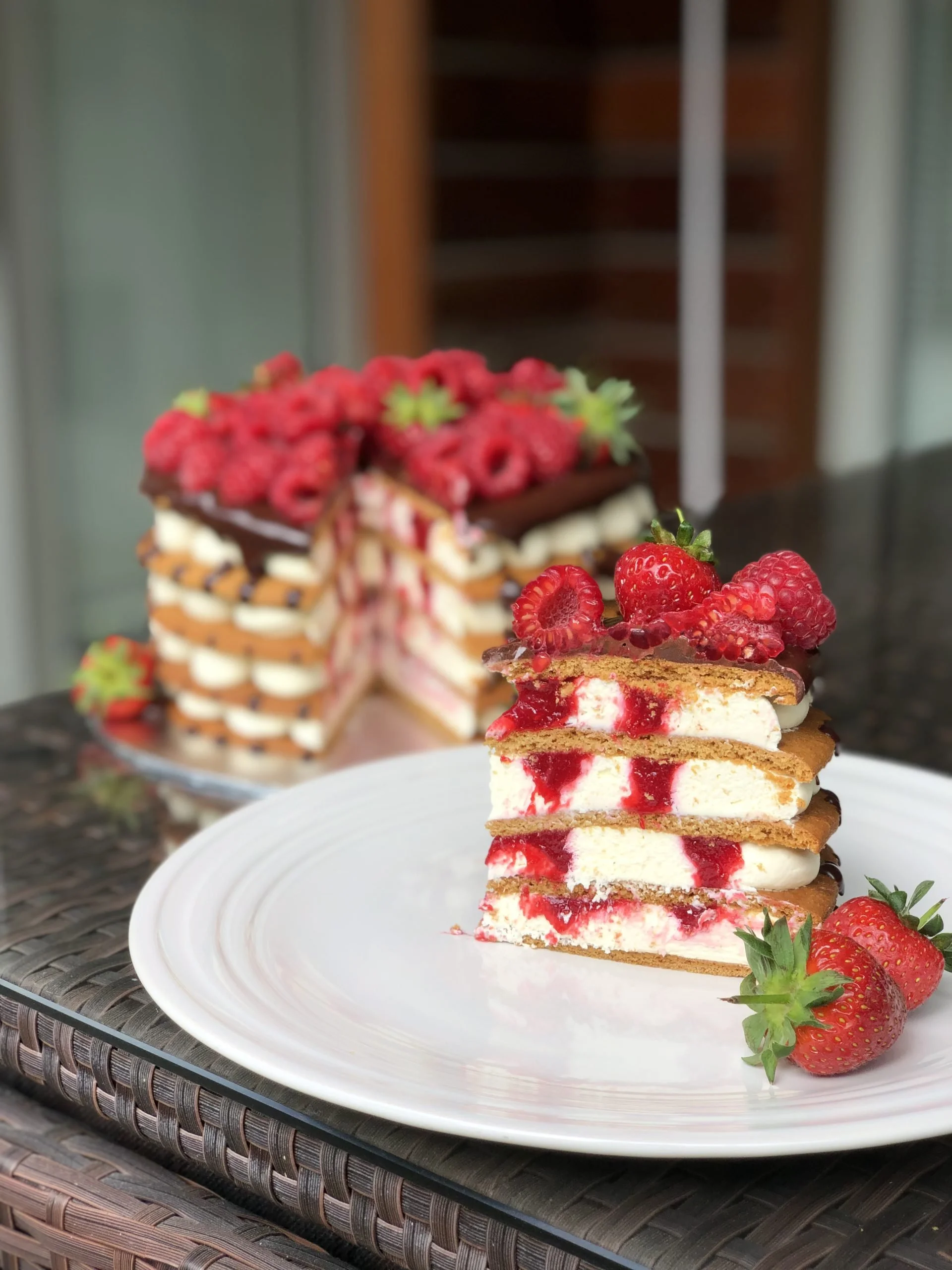 Также медовик в медовой крошке и красивый ободок из крема с ягодами.